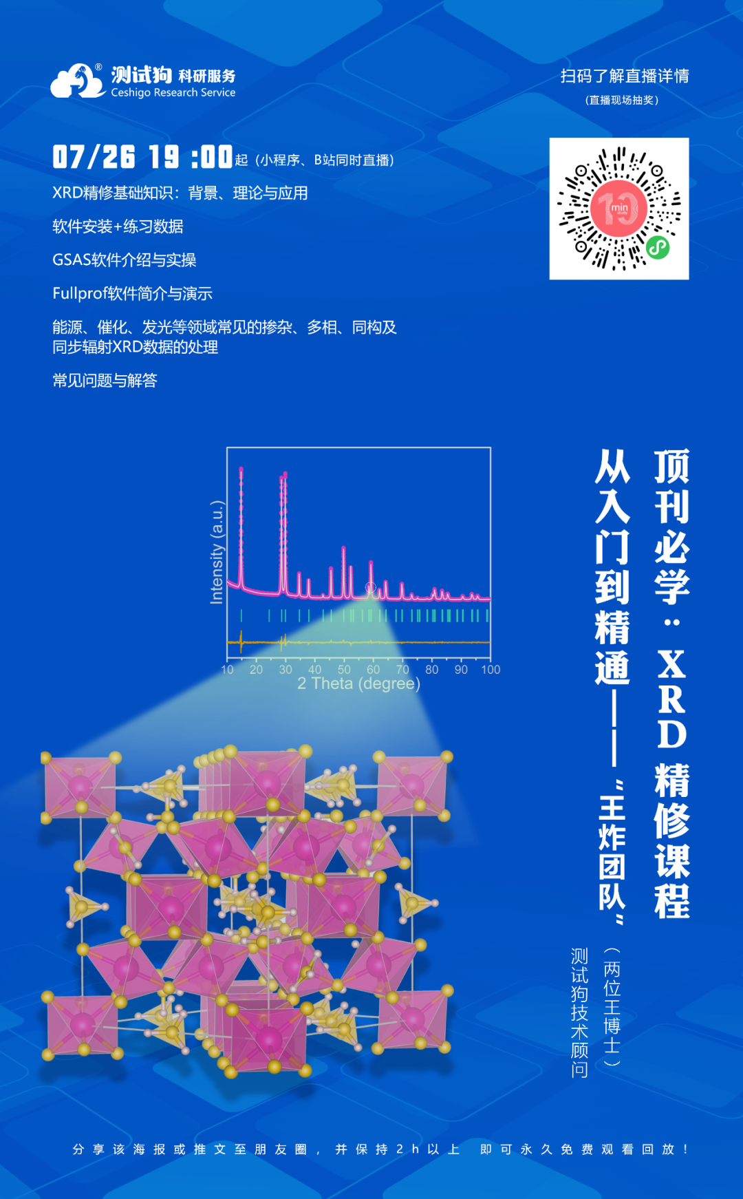 本次課程我們有幸邀請到了“王炸團隊”(兩位王老師)來對XRD精修的基礎知識、軟件操作及其在儲能材料、催化材料和發光材料等領域的應用進行詳細講解。XRD精修的軟件有很多,最常用的是GSAS和Fullprof軟件。兩位老師,一位擅長GSAS軟件,一位擅長Fullprof軟件,讓你想學哪個學哪個,無論哪個都能學會!